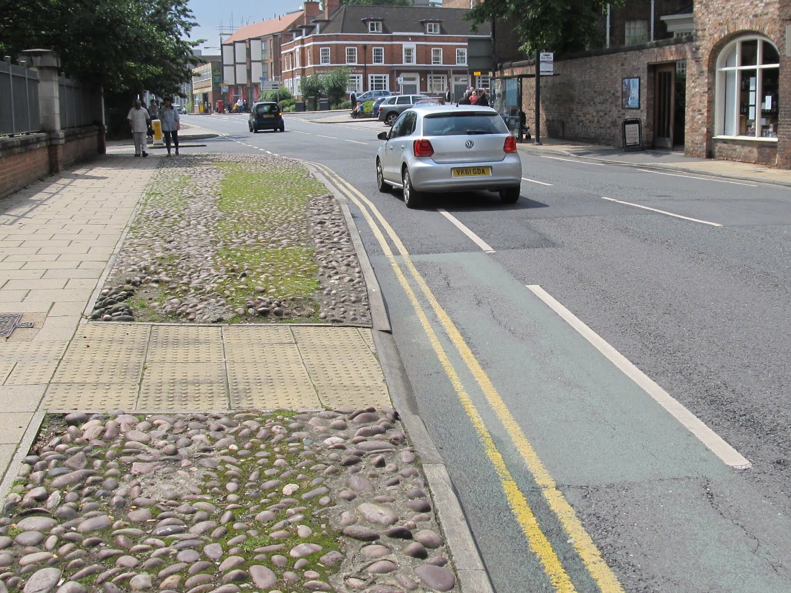 A very simple and economic way of designing for collisions between cyclists and drivers is to ensure that a cycle lane is brought into conflict with overtaking motor vehicles. This example from Peasholme Green in York possesses all the design virtues of classic simplicity. This is a primary route into the city centre. The cobbled verge possesses no historic significance and the cobbles were placed there for aesthetic reasons.