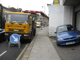 I've seen this before at this location (Hoe Street E17, close to the junction with Milton Road). A lorry parks at the kerb and the arm of an articulated digger in the back swings out over the pavement to excavate inside a derelict building. It empties material into the back of the lorry. There is just one man operating this machinery and he hasn't got a clue about pedestrian safety. But then judging by the sign in the cycle lane he thinks he's in the USA. Needless to say there was no attempt afterwards to clean up all the mud left scattered across the pavement. Yesterday.